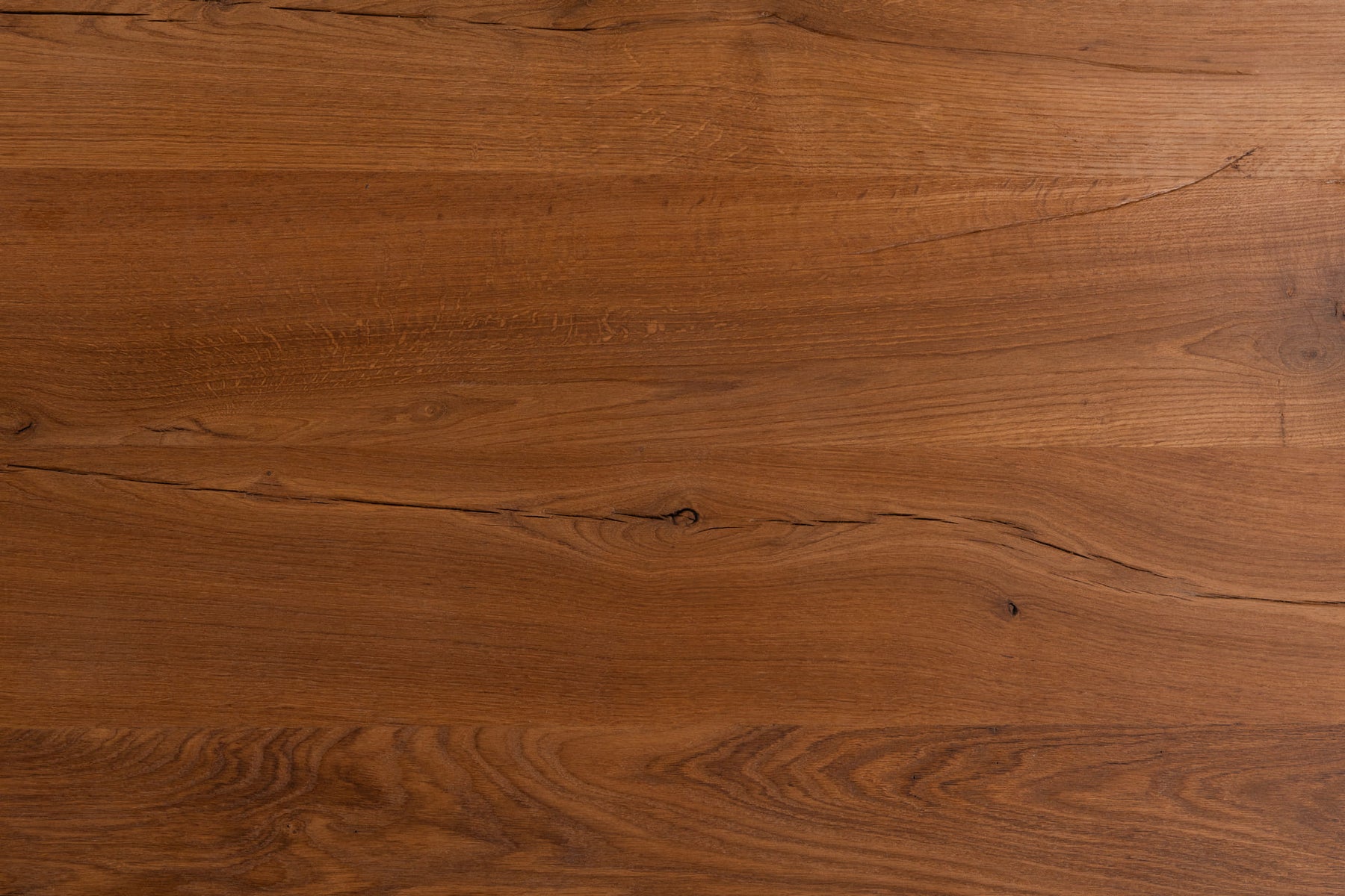 - Solid oak table base, protected by a clear sealant. Distinctive curves, grooves, patterns, and exposed knots speak to the wood's provenance.